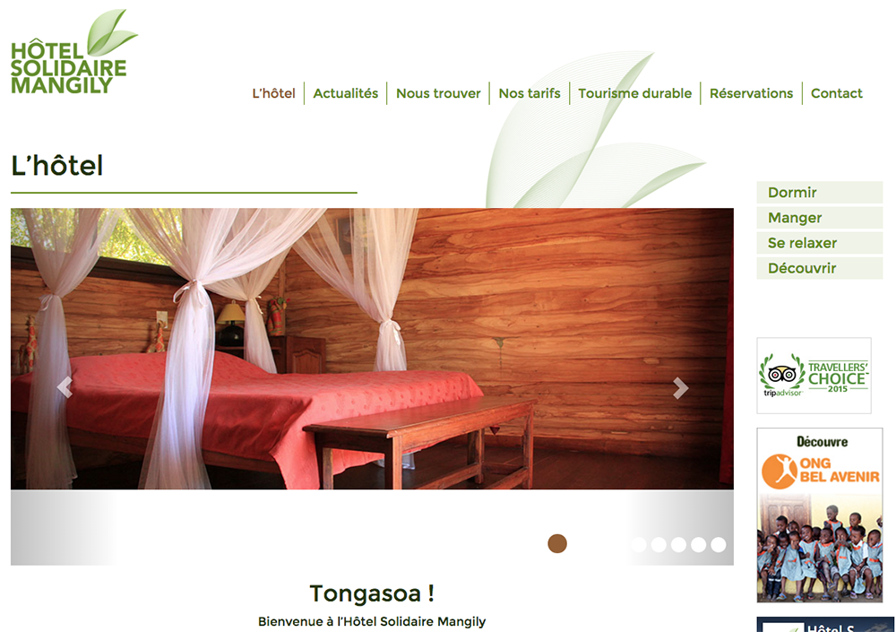 En un entorno tranquilo, a 10 minutos de la playa y en la linde de un bosque de baobabs milenarios, el Hotel Solidario Mangily dispone de 5 bungalows (con camas de matrimonio), 2 bungalows dobles (con 2 camas individuales) y 3 bungalows familiares, uno de ellos con acceso para discapacitados.